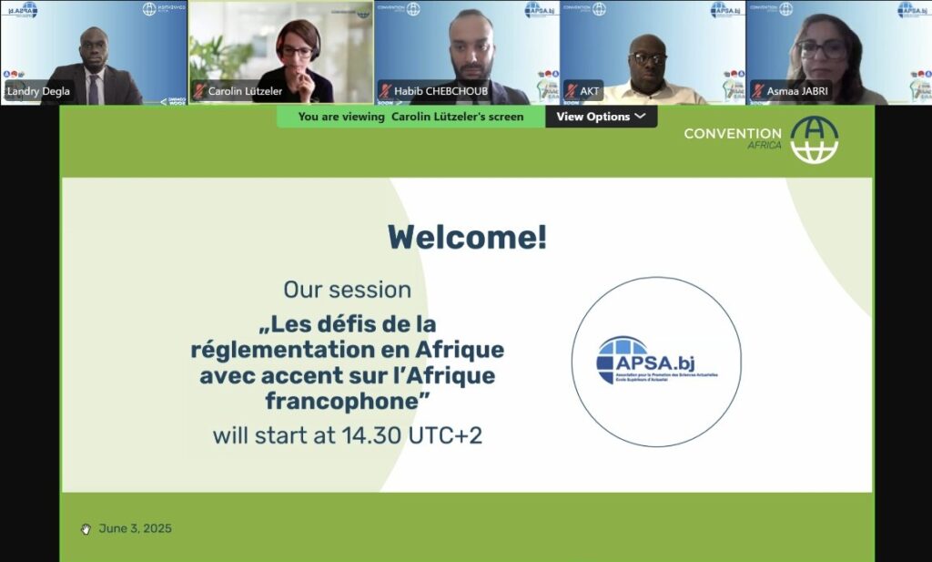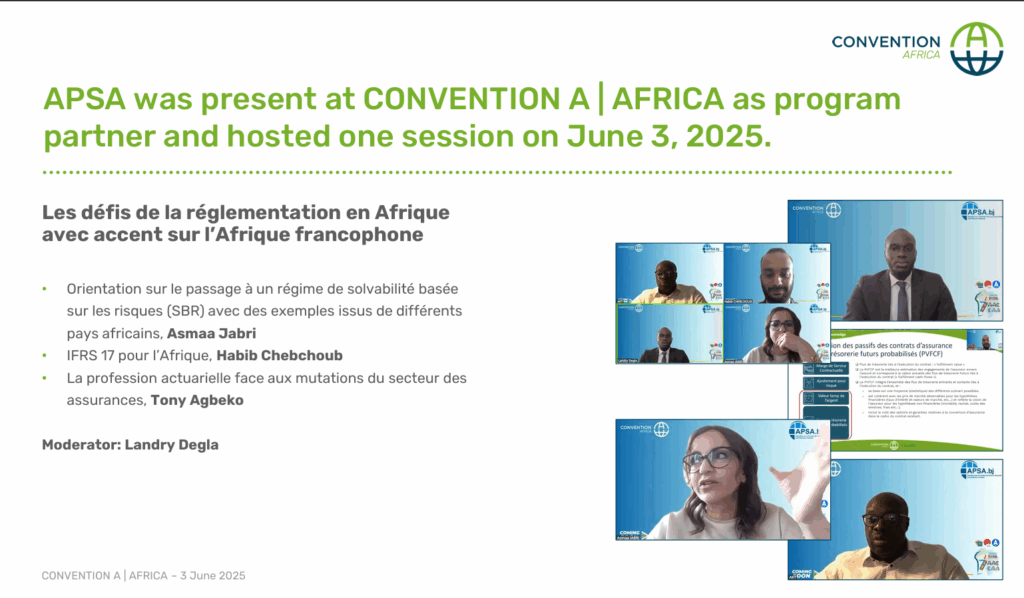 Le 3 juin 2025, l’Association pour la Promotion des Sciences Actuarielles au Bénin a organisé, dans le cadre de la Convention A Africa et en collaboration avec Actuview, une session intitulée : «Les défis de la réglementation en Afrique avec un accent sur l’Afrique francophone».